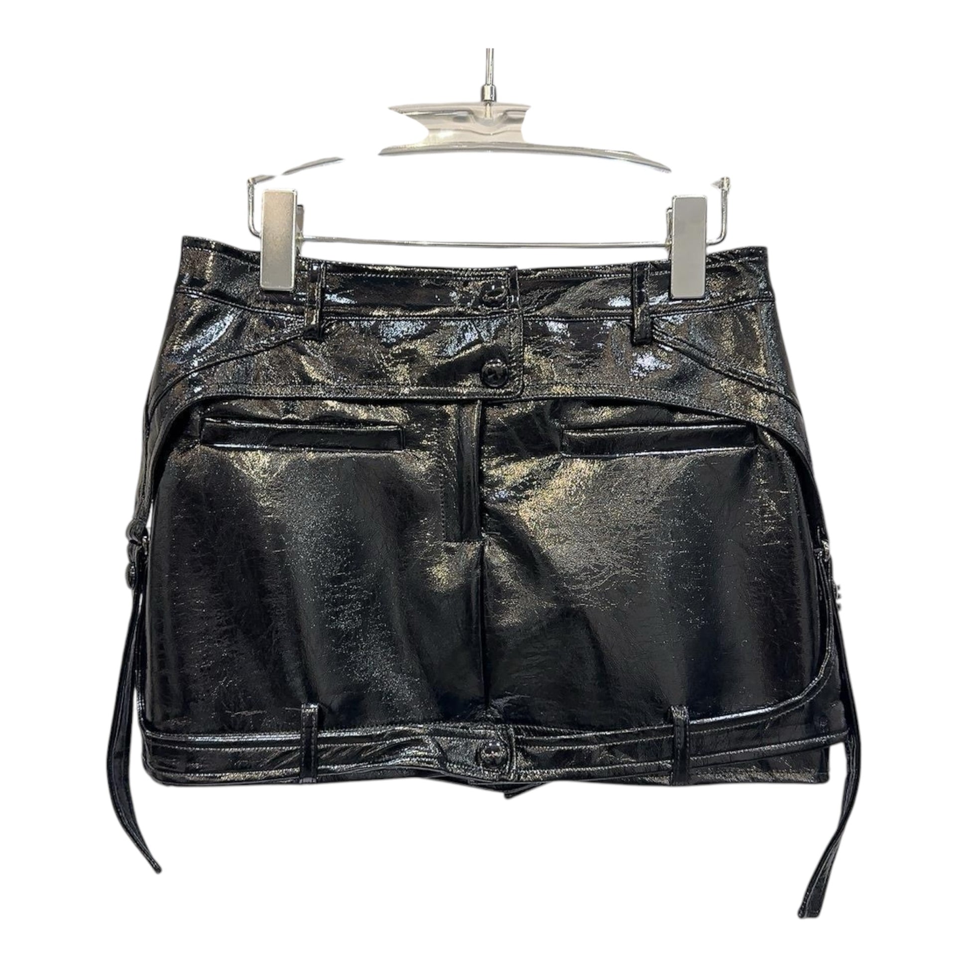 Gonna mini metallizzata con pantaloncino invisibile incorporato dallo stile audace e contemporaneo, caratterizzata da un effetto lucido. Presenta una struttura unica con una sovrapposizione sul davanti e sul retro, delineata da cuciture decorative. La parte superiore include passanti per cintura e un dettaglio di doppio bottone a pressione per un tocco moderno.