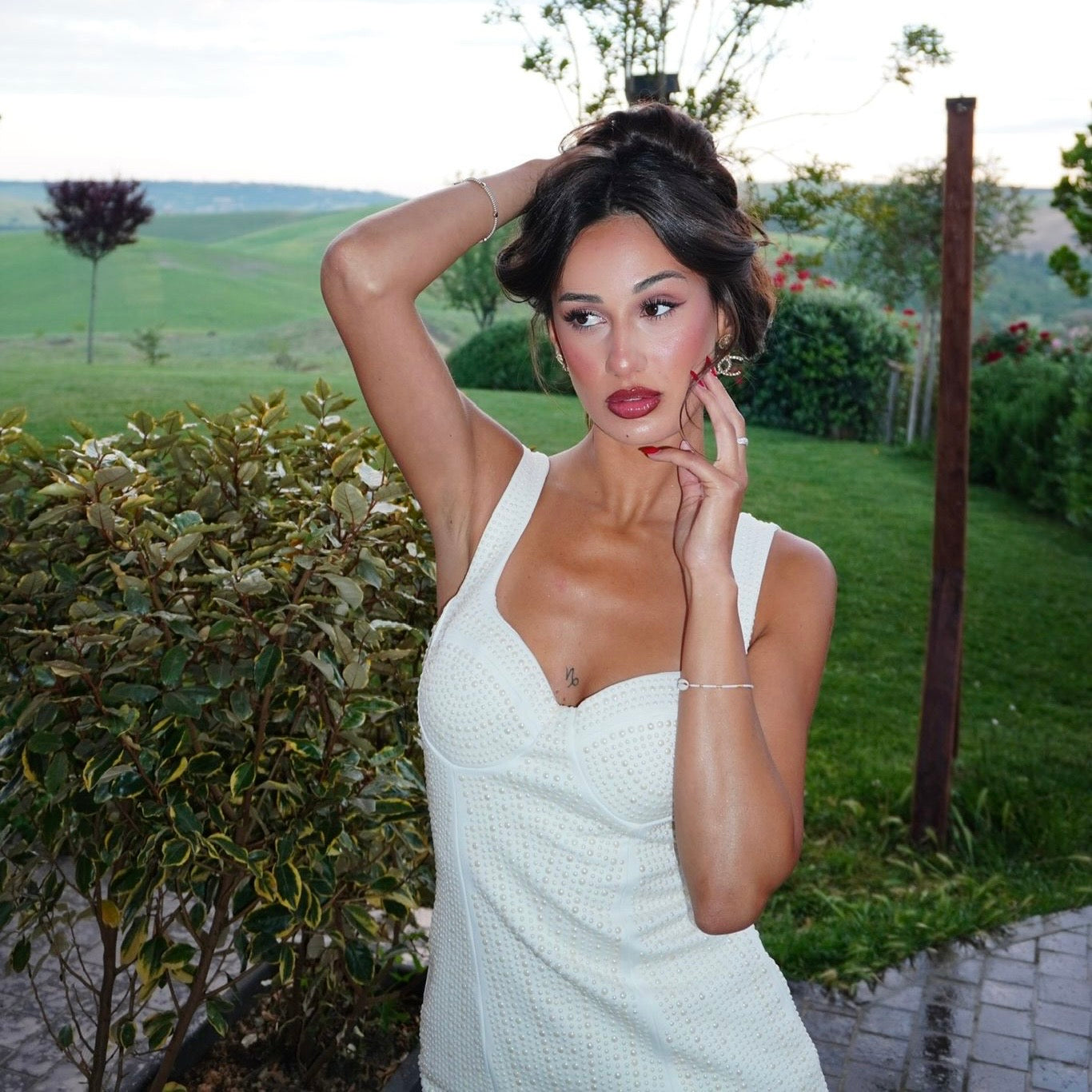 Mini abito completamente realizzato con una lavorazione in perline bianche, che creano una texture raffinata e luminosa. Il design aderente valorizza la silhouette, mentre il bustier strutturato con coppe esalta il décolleté, garantendo un look elegante e sensuale. Le spalline larghe offrono un perfetto equilibrio tra supporto e stile. Il dettaglio che cattura l'attenzione è il choker coordinato, anch'esso decorato con perline, che aggiunge un tocco di glamour e originalità. Ideale per eventi esclusivi o serate speciali, questo abito è una scelta sofisticata e unica per chi desidera farsi notare con classe.
