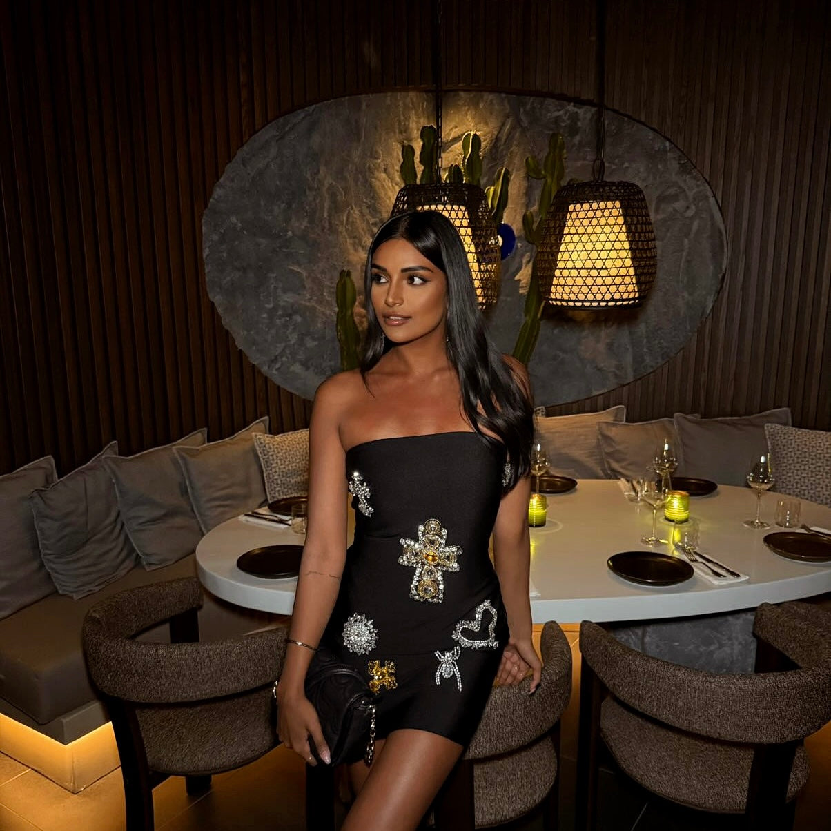 Realizzato in un tessuto stretch per garantire una vestibilità aderente e confortevole, l’abito è impreziosito da dettagli gioiello che aggiungono un tocco di lusso. Le decorazioni includono croci scintillanti, cuori e disegni geometrici, arricchiti da strass e applicazioni dorate, che creano un effetto ricercato e sofisticato.