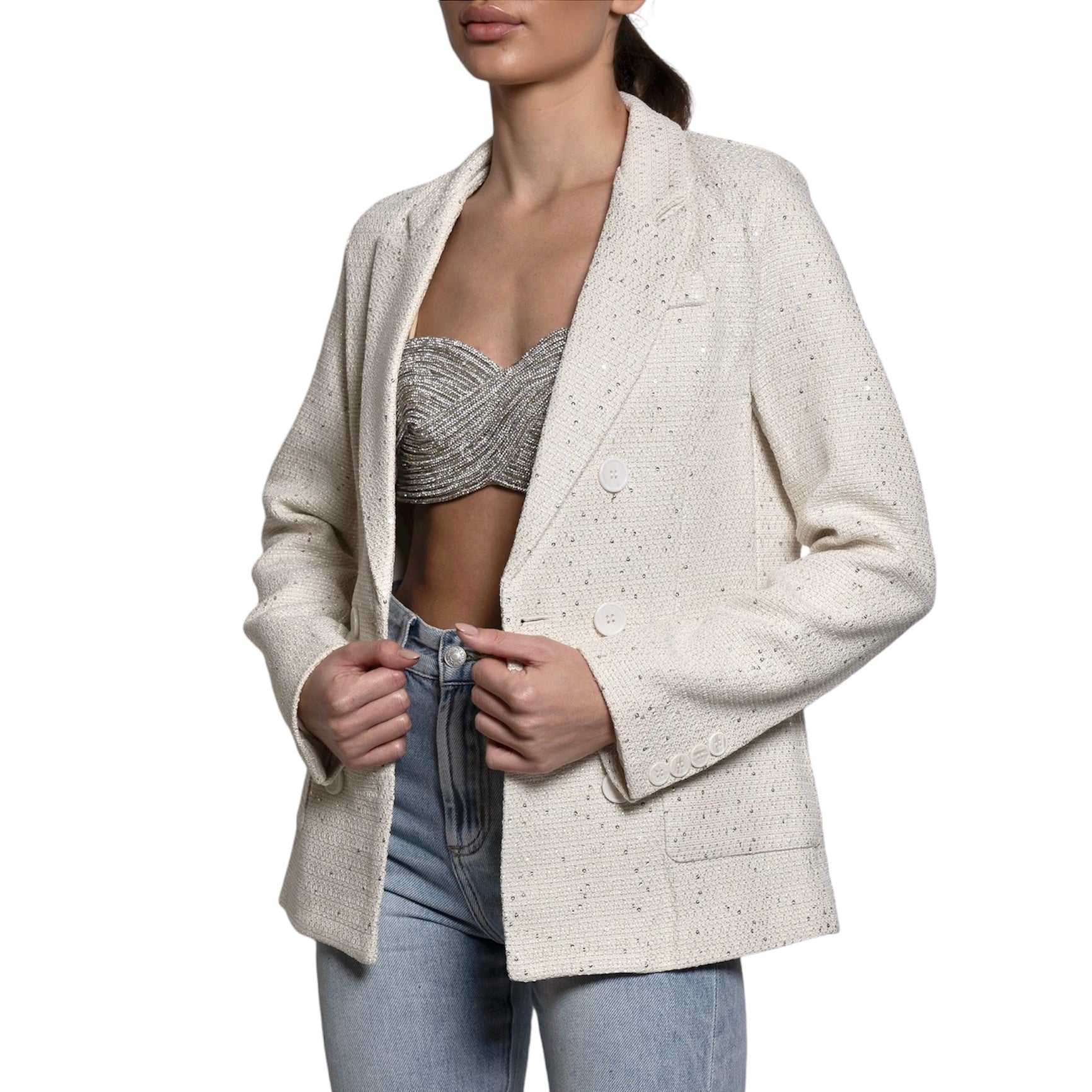 Aggiungi un tocco di eleganza sofisticata al tuo guardaroba con questa giacca doppiopetto in tessuto color perla arricchita da delicati dettagli luminosi. Il taglio classico, valorizzato da bottoni tono su tono, offre una vestibilità comoda e versatile, perfetta per ogni occasione, dal giorno alla sera. Le linee pulite e la finitura raffinata rendono questa giacca ideale sia per look casual con jeans, sia per uno stile più formale. Il tessuto strutturato dona una sensazione di qualità e resistenza, senza compromettere il comfort.